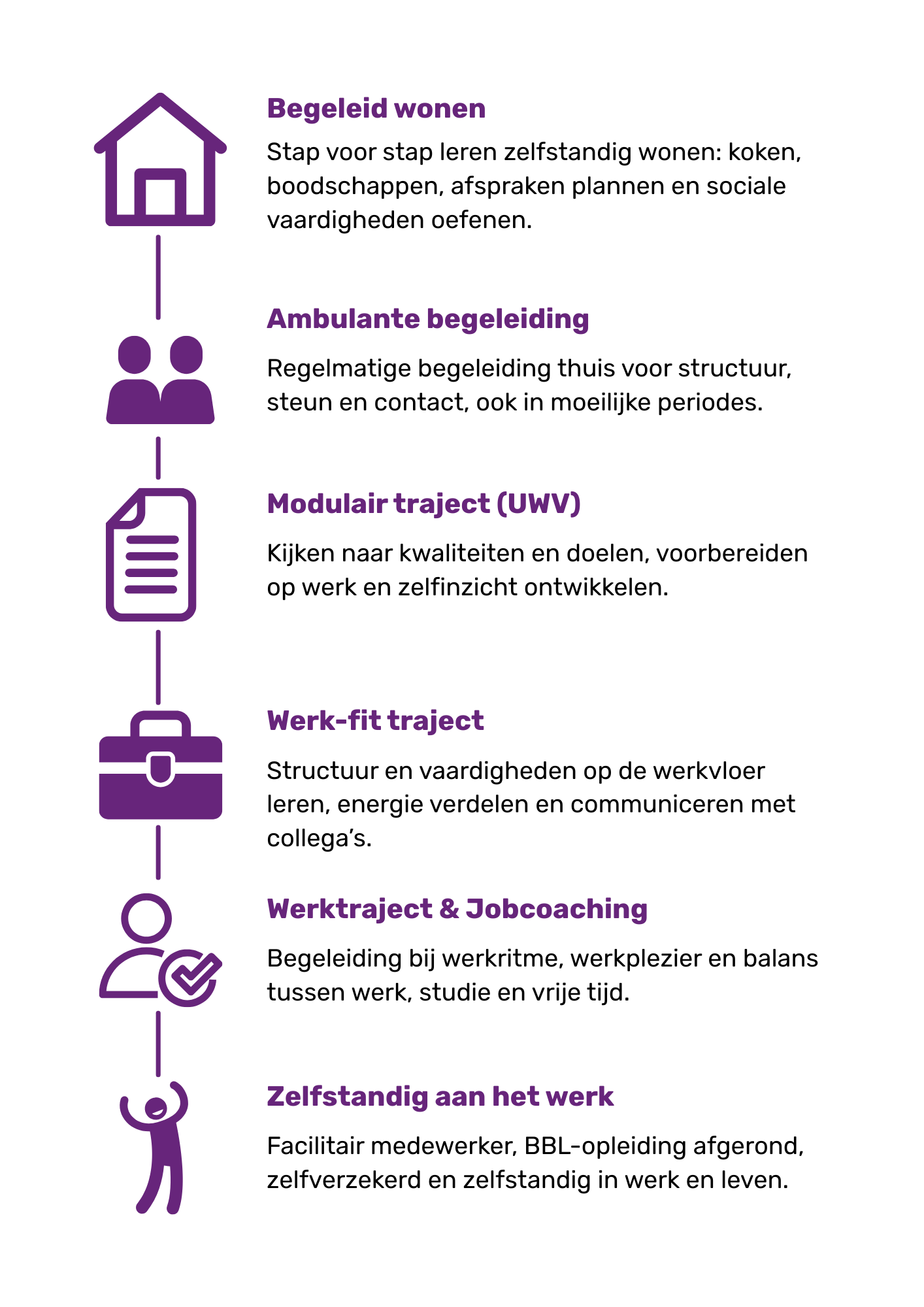 Myron werkt nu als facilitair medewerker en heeft zijn BBL-opleiding Facilitair Medewerker afgerond. “Ik voel me zelfverzekerder en kan steeds meer zelfstandig keuzes maken,” vertelt hij trots. Zijn doelen: verder ontwikkelen in zijn werk, een stabiel sociaal netwerk opbouwen en een gezonde balans behouden.