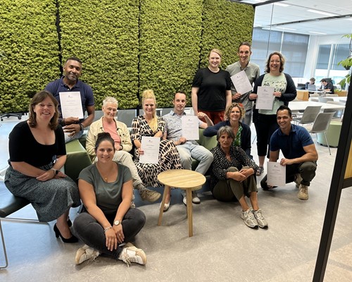 Op de foto: docenten met hun ontvangen certificaat. Niet alle docenten waren aanwezig bij het maken van de foto. Bron: Projectgroep Jobcoaching (2023).