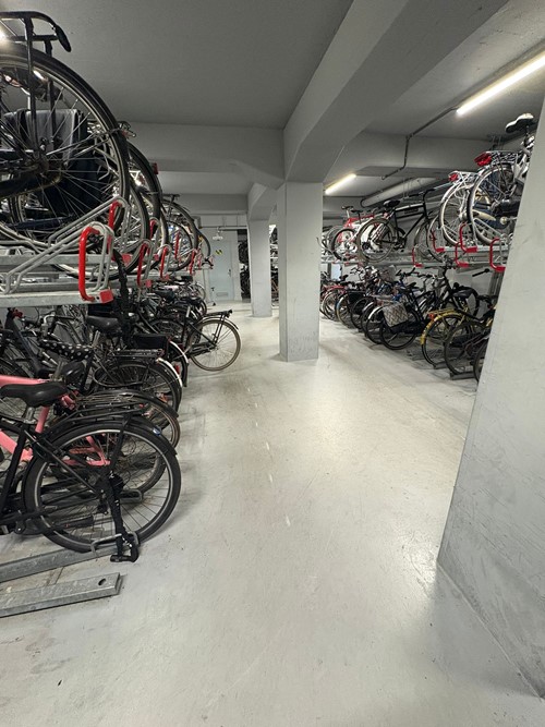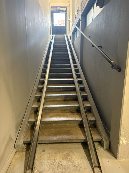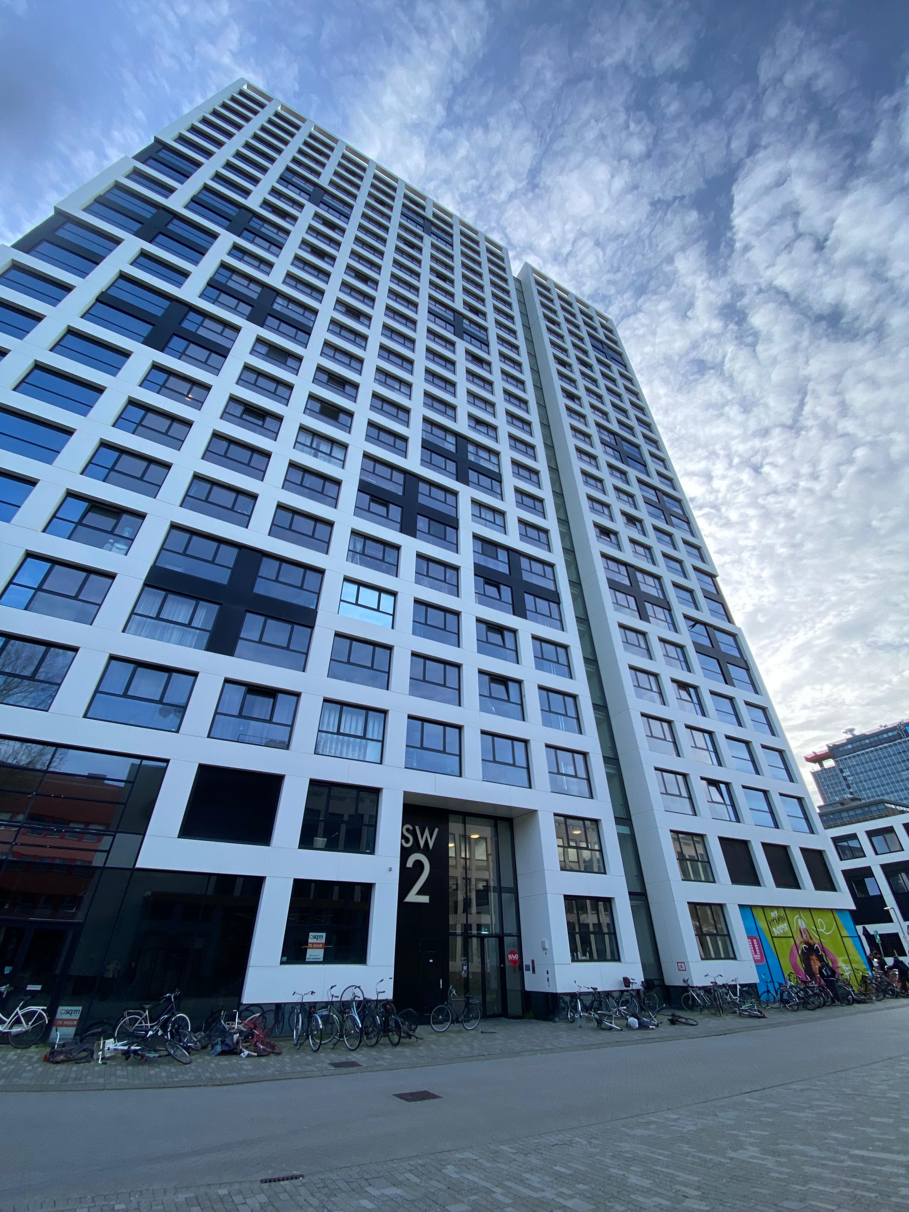 Het gebouw heeft twee ingangen. Je kunt de deuren naar de gezamenlijk ruimtes in het gebouw openen met een elektronische sleutel.